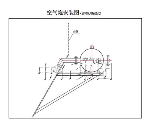因空氣炮用到鋼結構倉上,炮體小、重量輕,可采用吊掛式,與炮口形成三點定面的穩固結構。空氣炮倉內的噴嘴也是安裝注意的要點,掌握不好,達不到應有的效果。安裝時,應讓噴嘴下唇近貼內倉壁,使噴出的氣流順藏椎體內壁噴發,破處物料支點。